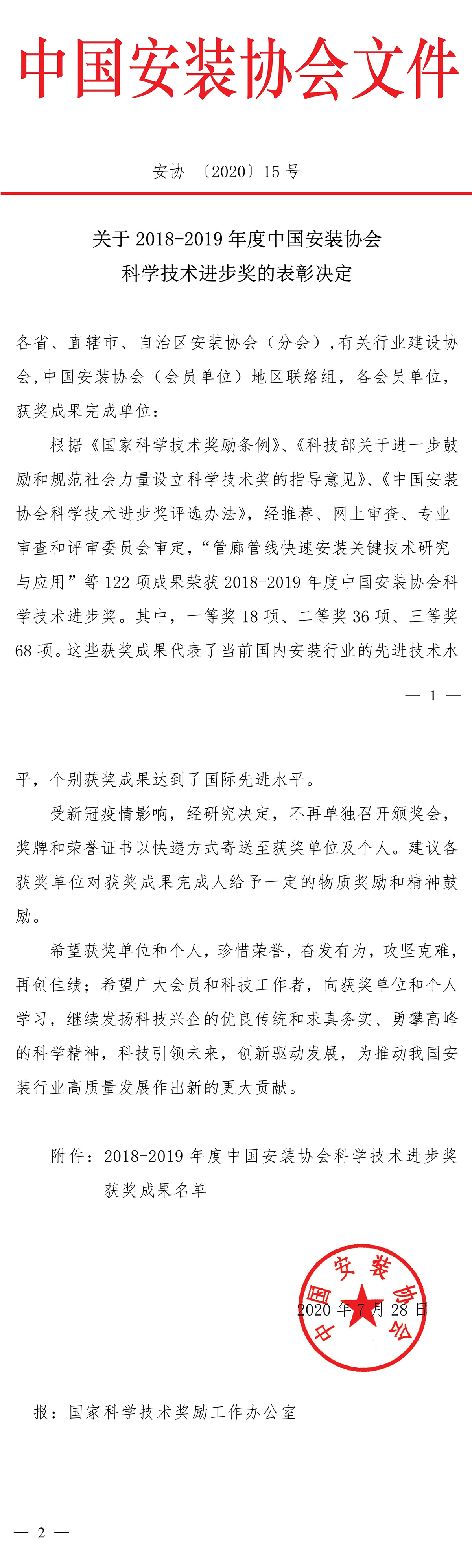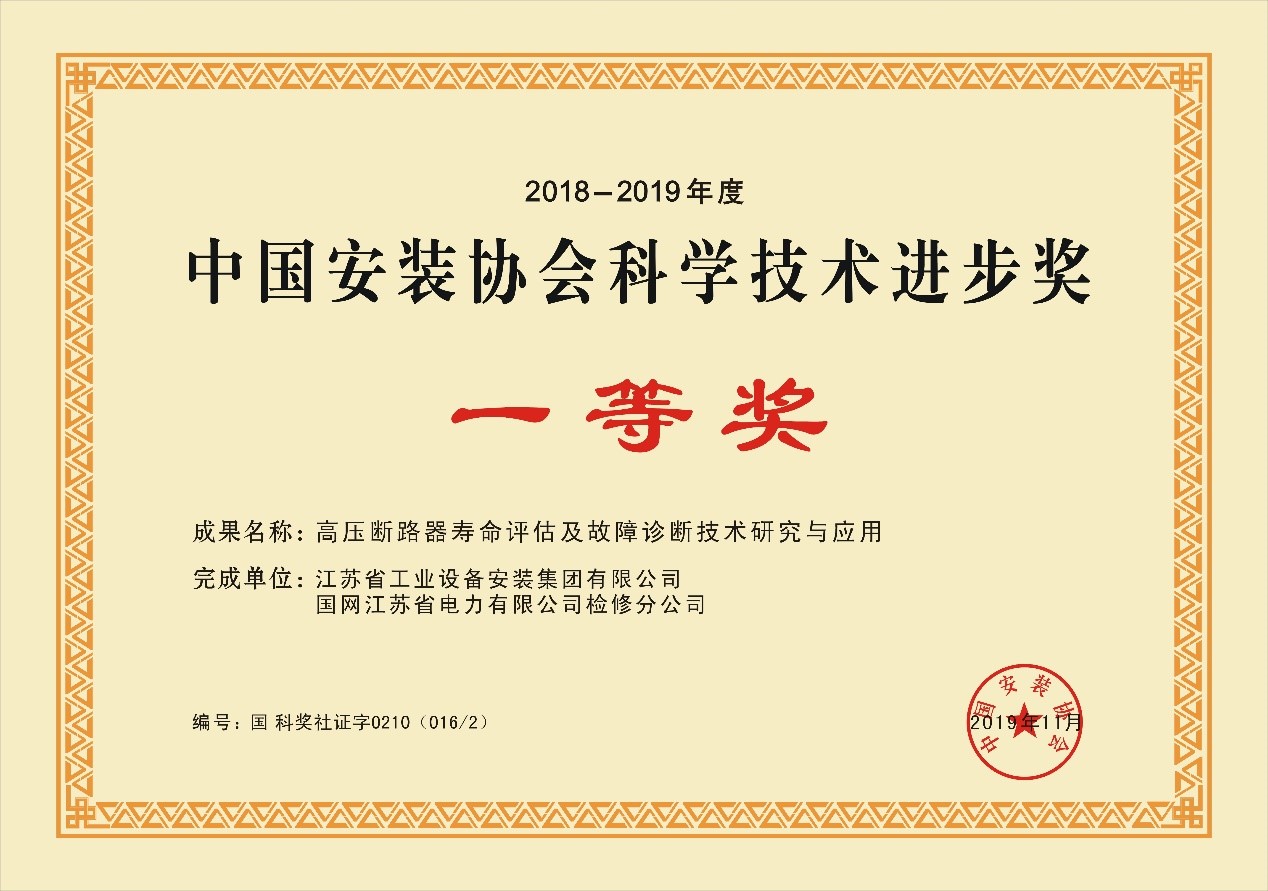 8月4日,中國安裝協會(hui) 頒布了《關(guan) 於(yu) 2018-2019年度中國安裝協會(hui) 科學技術進步獎的表彰決(jue) 定》,江蘇省安申報的《高壓斷路器壽命評估及故障診斷技術研究與(yu) 應用》榮獲一等獎;《超長距離複雜地層大直徑管道與(yu) 光纜定向穿越技術》榮獲三等獎。