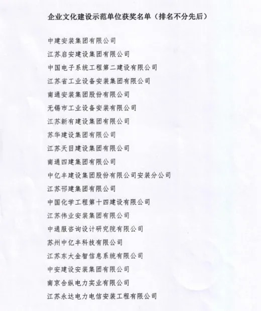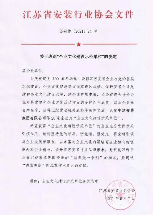 為(wei) 慶祝建黨(dang) 100周年華誕,江蘇省安裝行業(ye) 協會(hui) 表彰了一批在黨(dang) 的基層組織建設和企業(ye) 文化建設等方麵取得成績的單位,江蘇省安榮獲企業(ye) 文化建設示範單位稱號。
