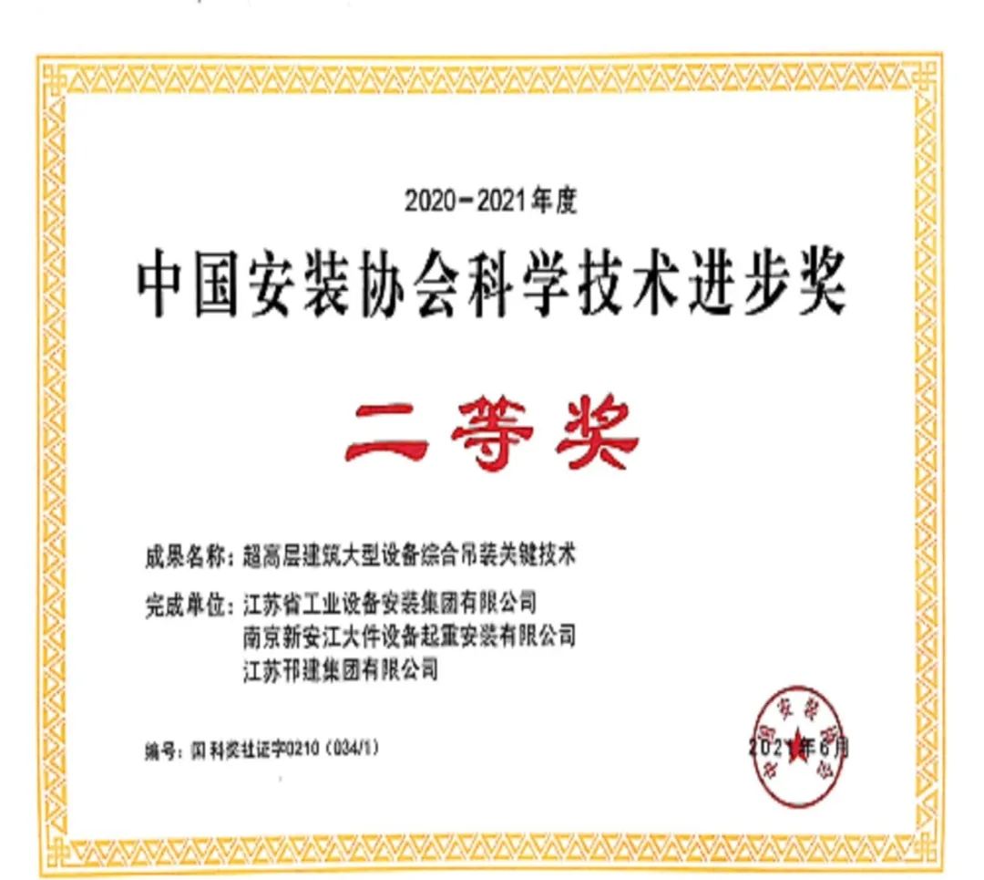 近日,科學技術進步獎表彰大會(hui) 於(yu) 南京國際青年會(hui) 議中心落幕,江蘇省AG庄闲安裝集團有限公司申報的《超高層建築大型設備綜合吊裝關(guan) 鍵技術》榮獲2020~2021年度中國安裝協會(hui) 科學技術進步獎二等獎。