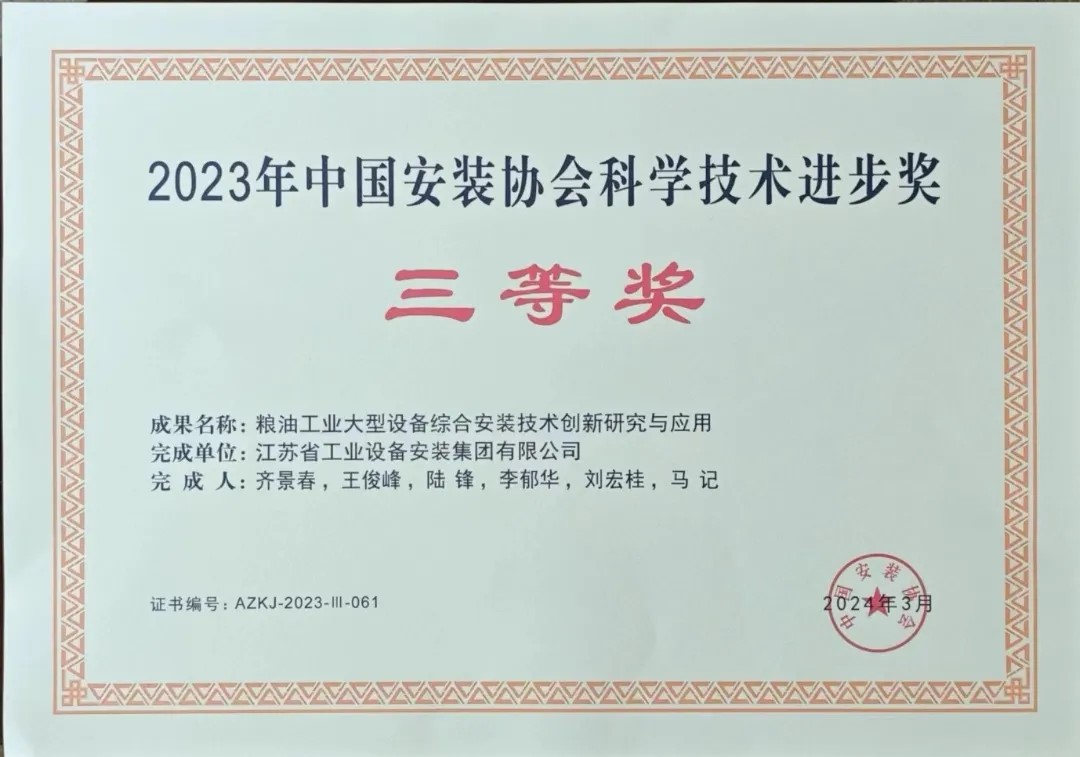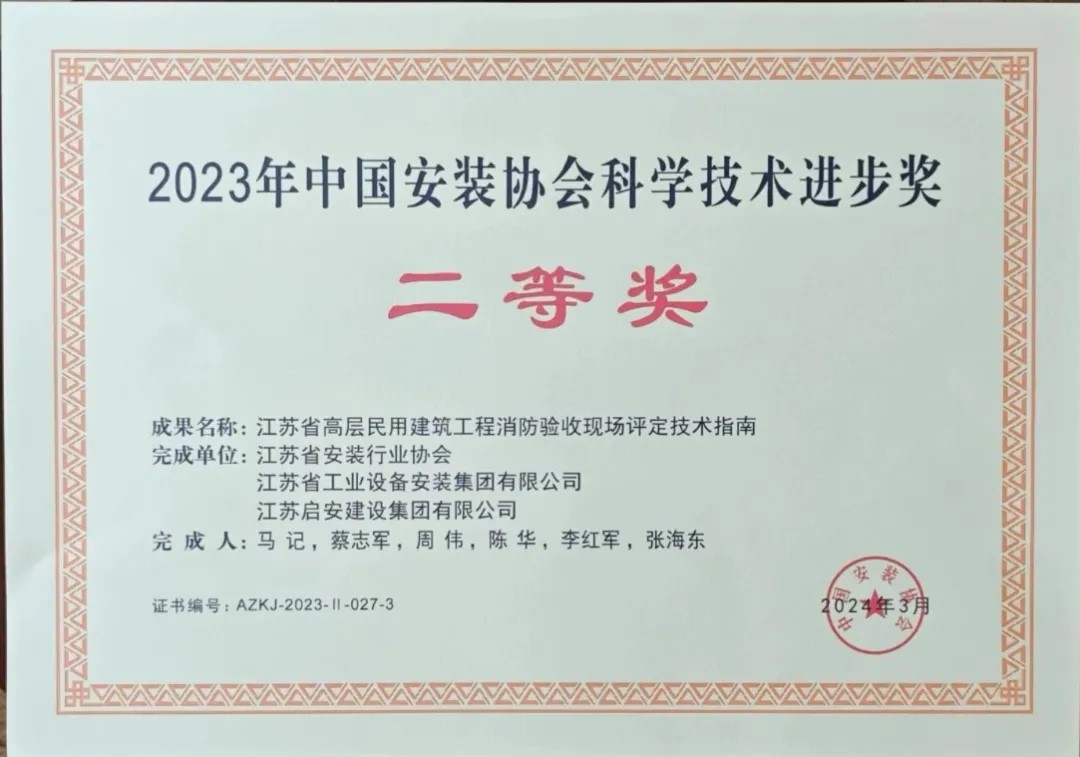 會(hui) 上,孟堅副會(hui) 長宣讀《關(guan) 於(yu) 表彰2023年中國安裝協會(hui) 科學技術進步獎獲獎單位的決(jue) 定》,向2023年中國安裝協會(hui) 科學技術進步獎獲獎單位和成果完成人代表頒發了榮譽證書(shu) 。其中包含我司獲得的兩(liang) 項科技進步獎:中國安裝協會(hui) 科學技術進步獎二等獎——“江蘇省高層民用建築工程消防驗收現場評定技術指南”,中國安裝協會(hui) 科學技術進步獎三等獎——“糧油工業(ye) 大型設備綜合安裝技術創新研究與(yu) 應用”。