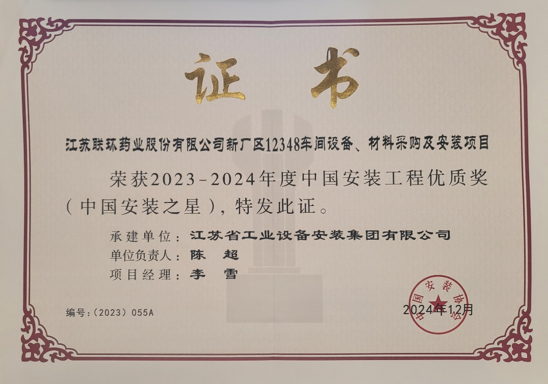 近日,中國安裝協會(hui) 公布2023-2024年度中國安裝工程優(you) 質獎(中國安裝之星)入選名單,我司承建的江蘇聯環藥業(ye) 股份有限公司新廠區12348車間設備、材料采購及安裝項目位列其中,江蘇省安再添1座金杯!