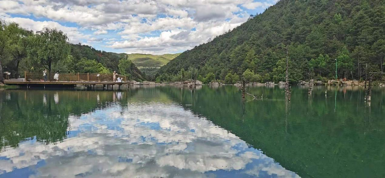 從(cong) 雪山下來,一路觀賞白水河、藍月穀,這也是一個(ge) 如仙境般存在的人間奇觀。白雲(yun) 朵朵飄於(yu) 半空,在水中不停變化自己的形象,引遊人無限遐想。湖水是一種透明的藍,寶石一樣鑲嵌在青山之間,晴空和碧藍的湖水交相輝映,如夢如幻,一瞬間讓人分不清到底是湖水映藍了天,還是白雲(yun) 本就是在湖水間。